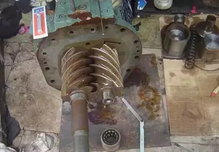 當(dāng)螺桿空壓機(jī)維修中轉(zhuǎn)子的嚙合端面轉(zhuǎn)到與機(jī)殼排氣相通時(shí),(此時(shí)壓縮氣體之壓力最高)被壓縮之氣體開(kāi)始排出,直至齒峰與齒溝的嚙合面移至排氣端面,此時(shí)兩轉(zhuǎn)子嚙合面與機(jī)殼排氣口這齒溝空間為零,即完成(排氣過(guò)程),在此同時(shí)轉(zhuǎn)子嚙合面與機(jī)殼進(jìn)氣口之間的齒溝長(zhǎng)度又達(dá)到最長(zhǎng),其吸氣過(guò)程又在進(jìn)行。